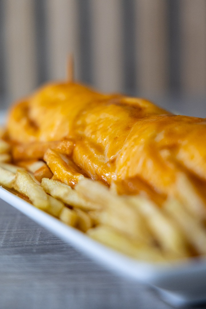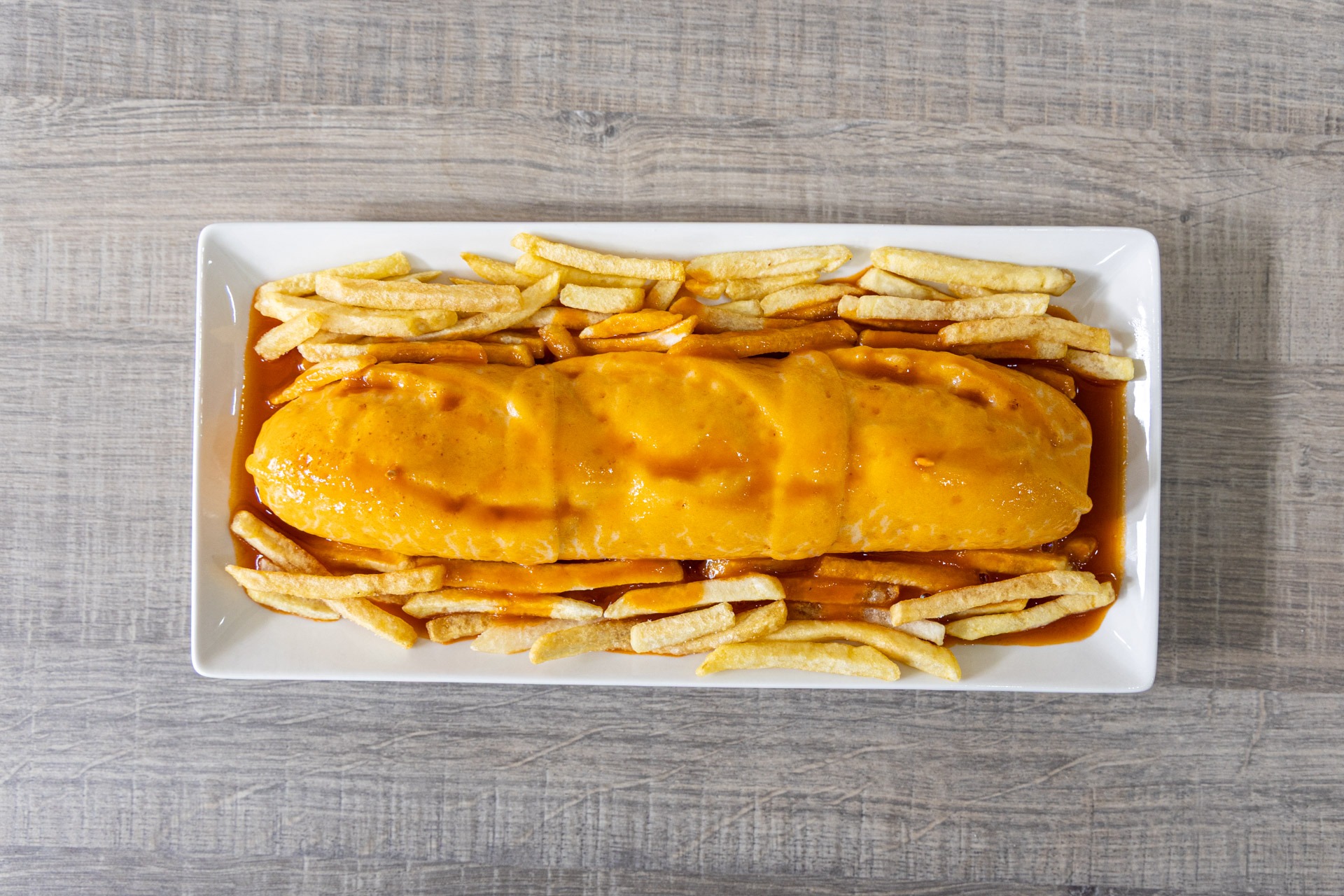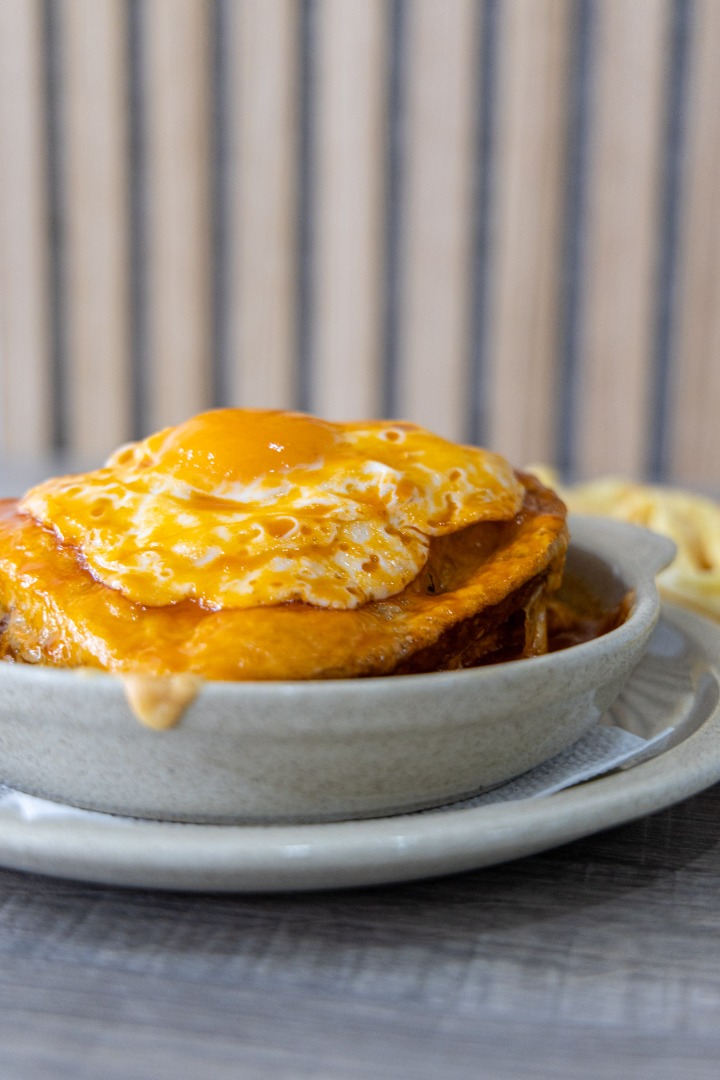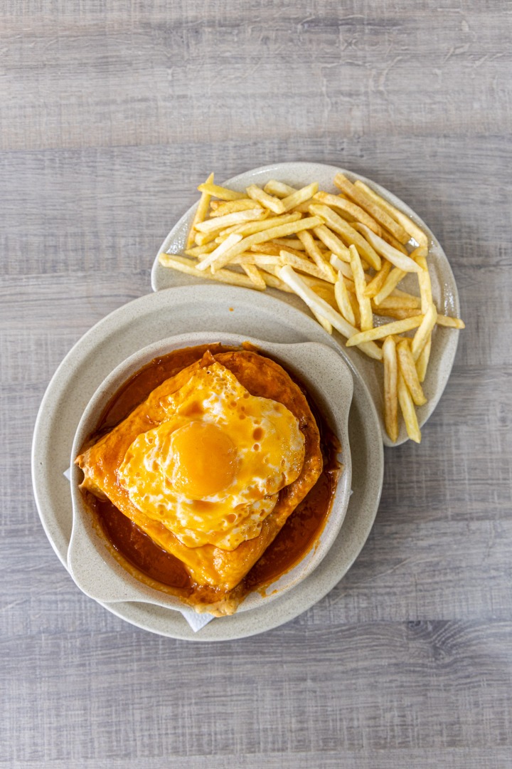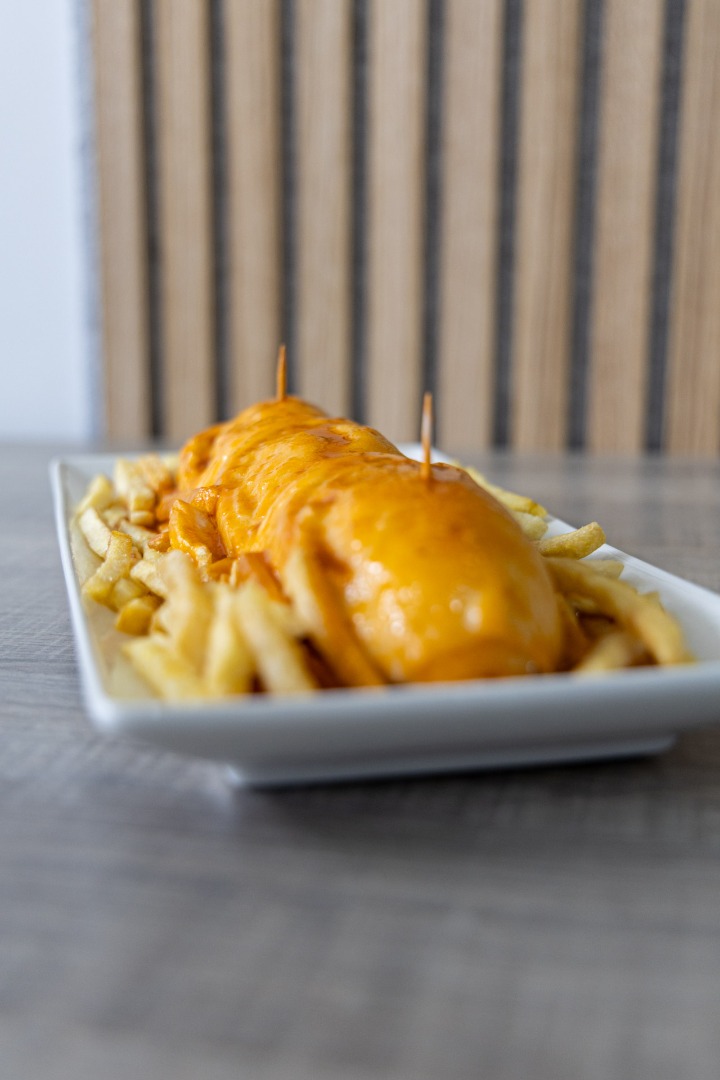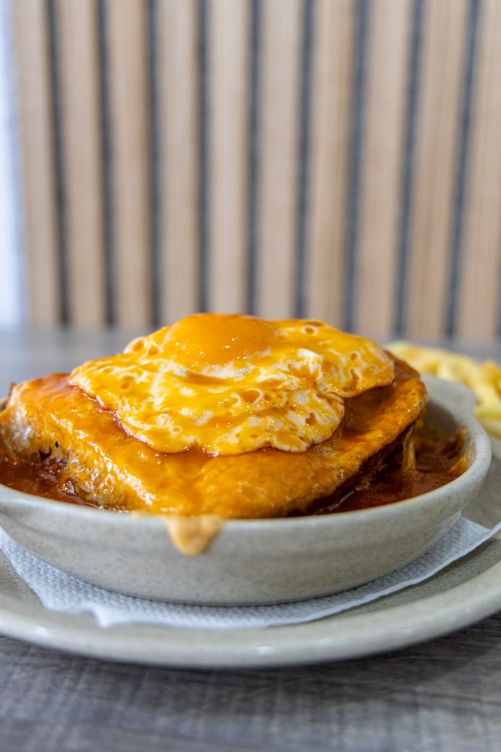Francesinha, prato típico português, com pão, carnes variadas, queijo derretido e molho especial, sabor intenso e reconfortante.