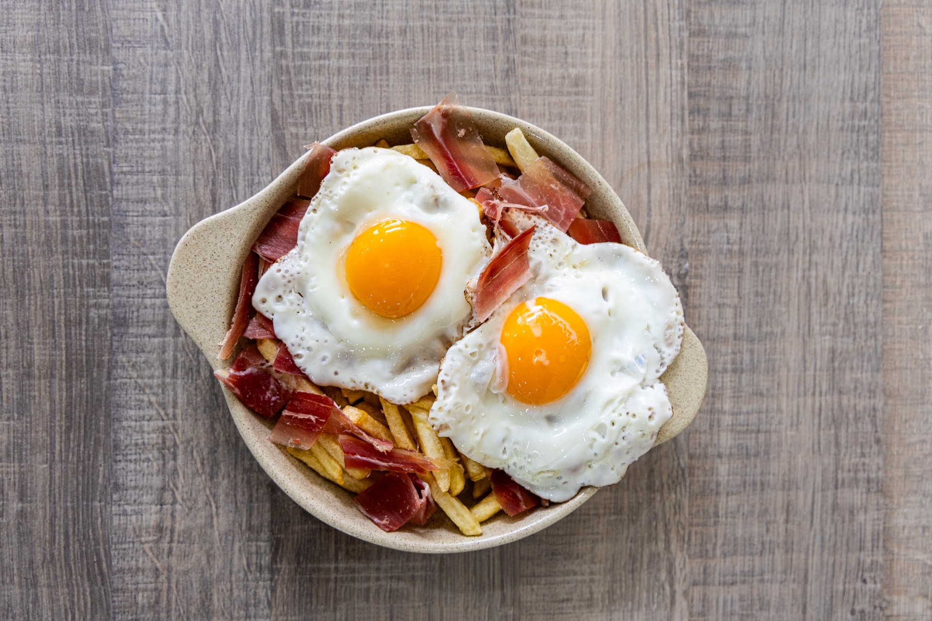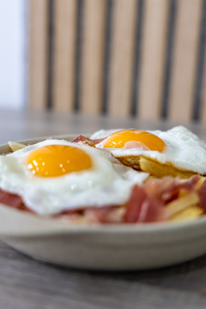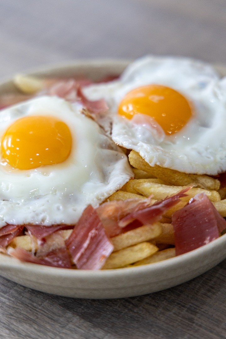 Ovos Rotos, prato tradicional espanhol com ovos estrelados sobre batatas fritas, saboroso e reconfortante.