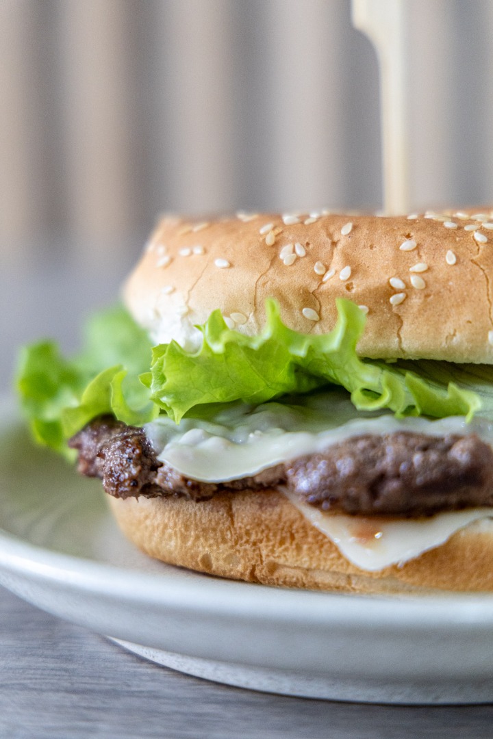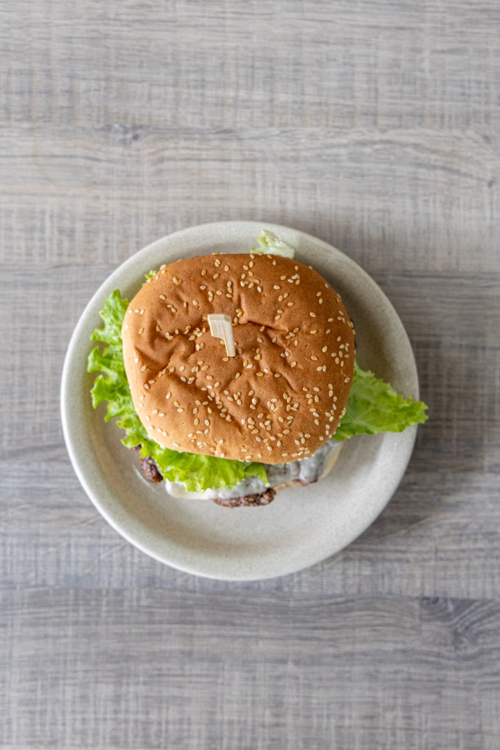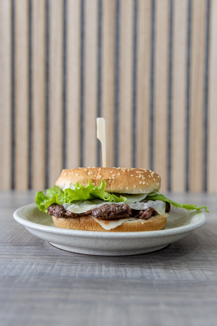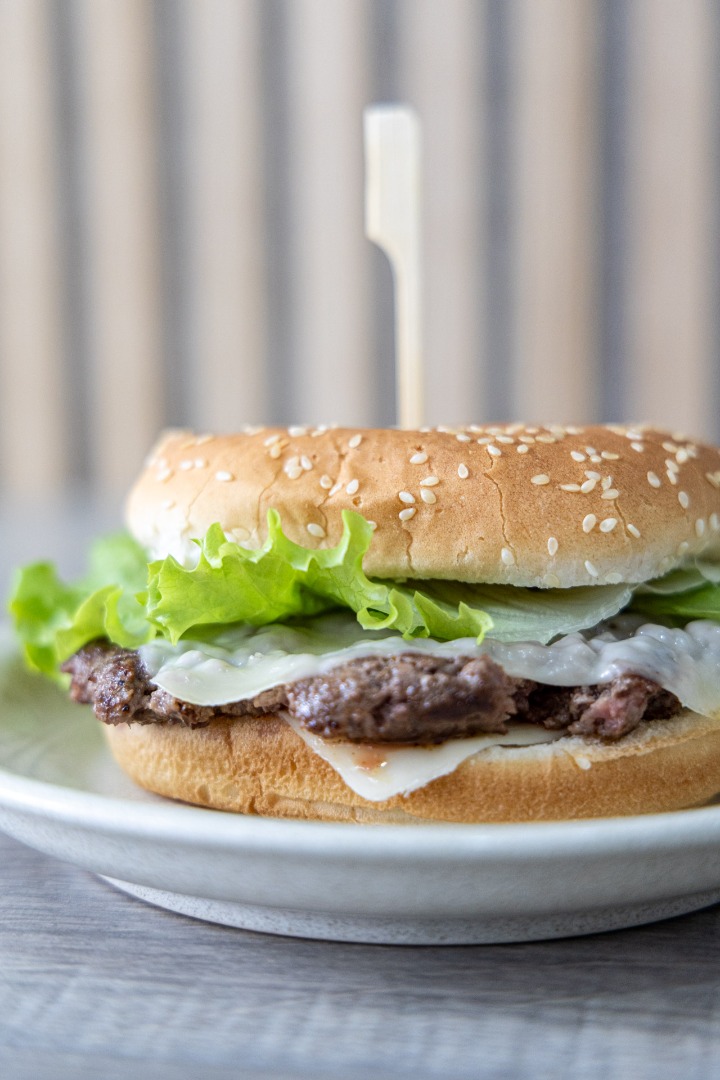 Hambúrguer Mirandesa com carne de qualidade, alface, tomate e queijo, saboroso e suculento.