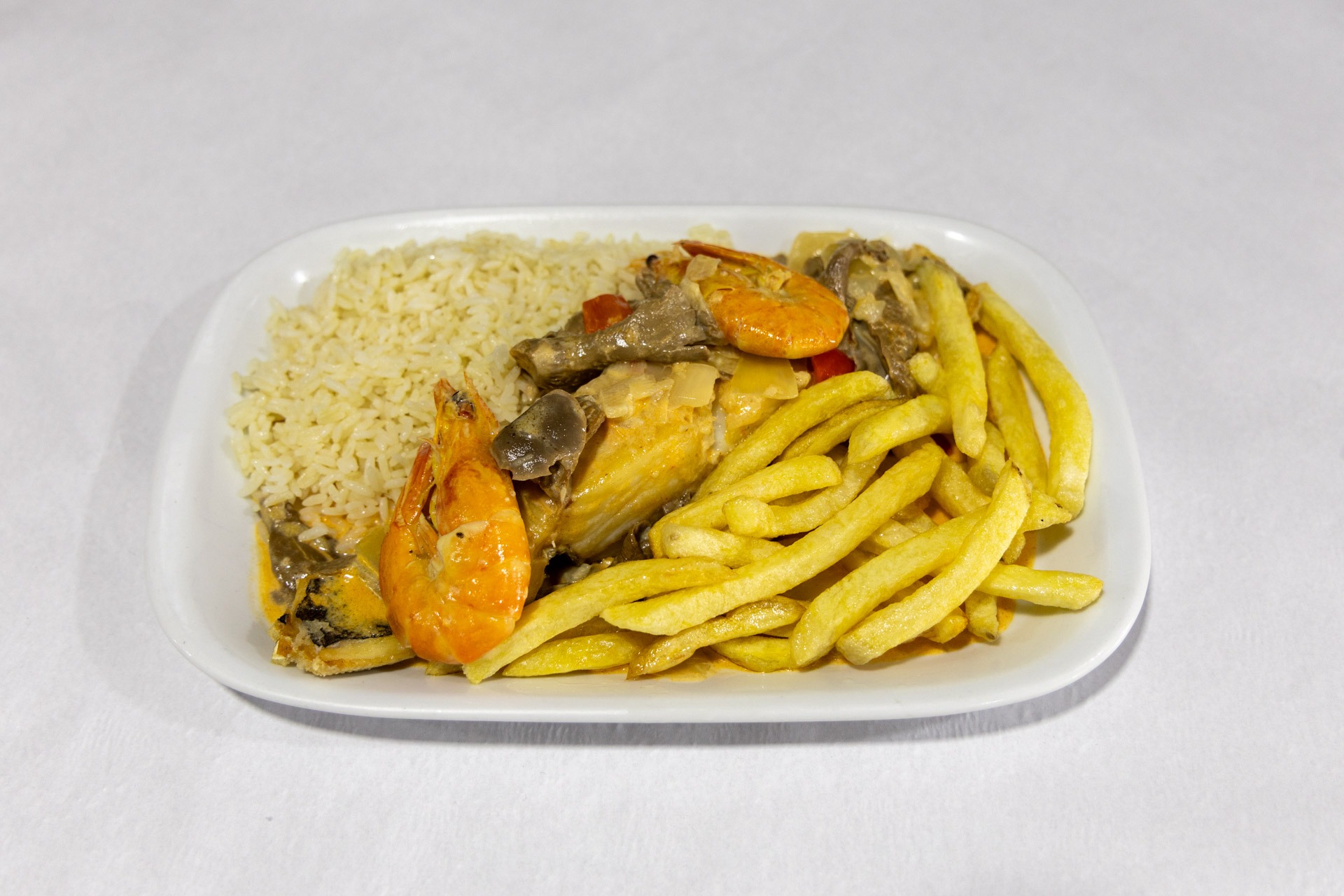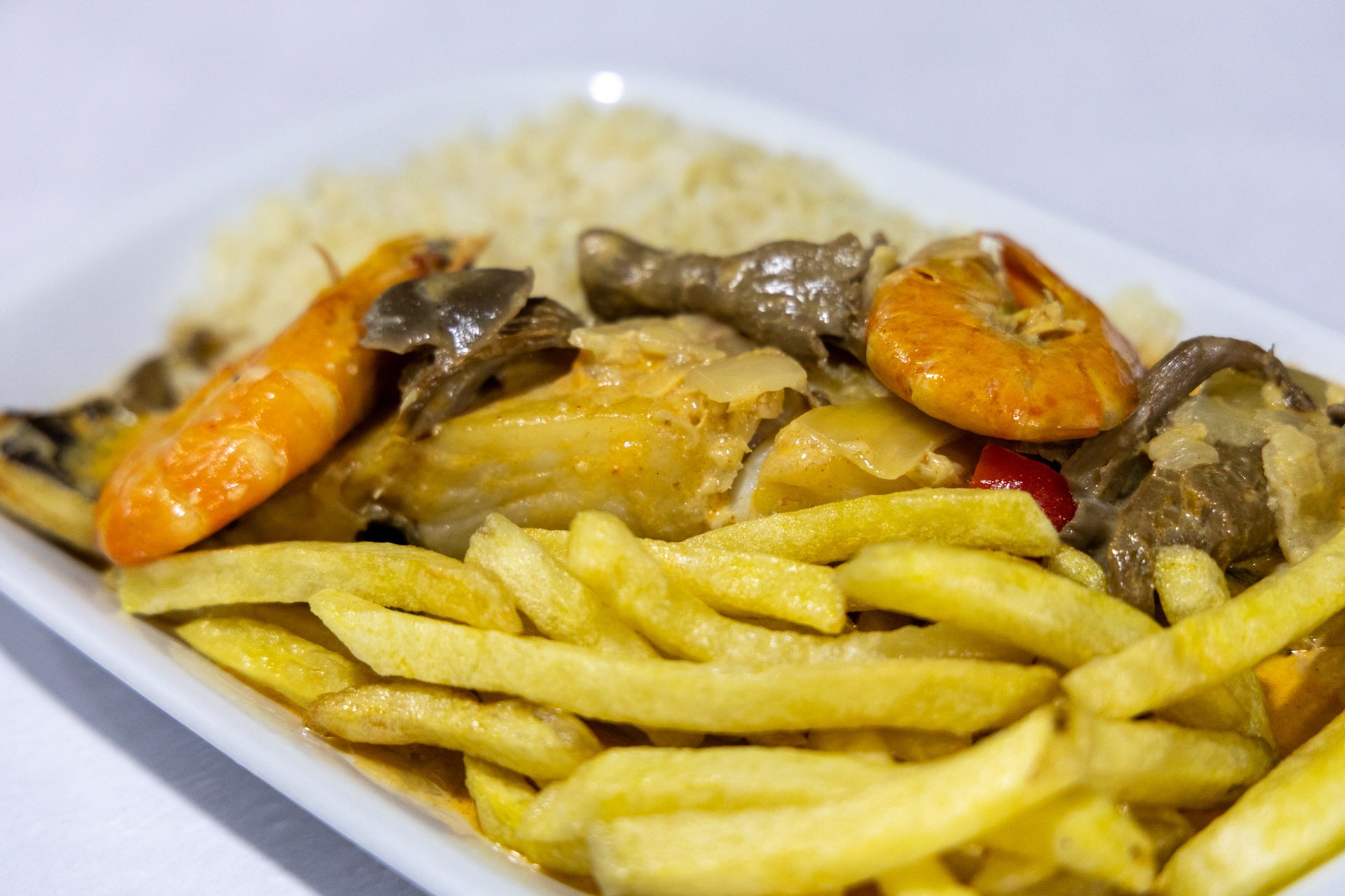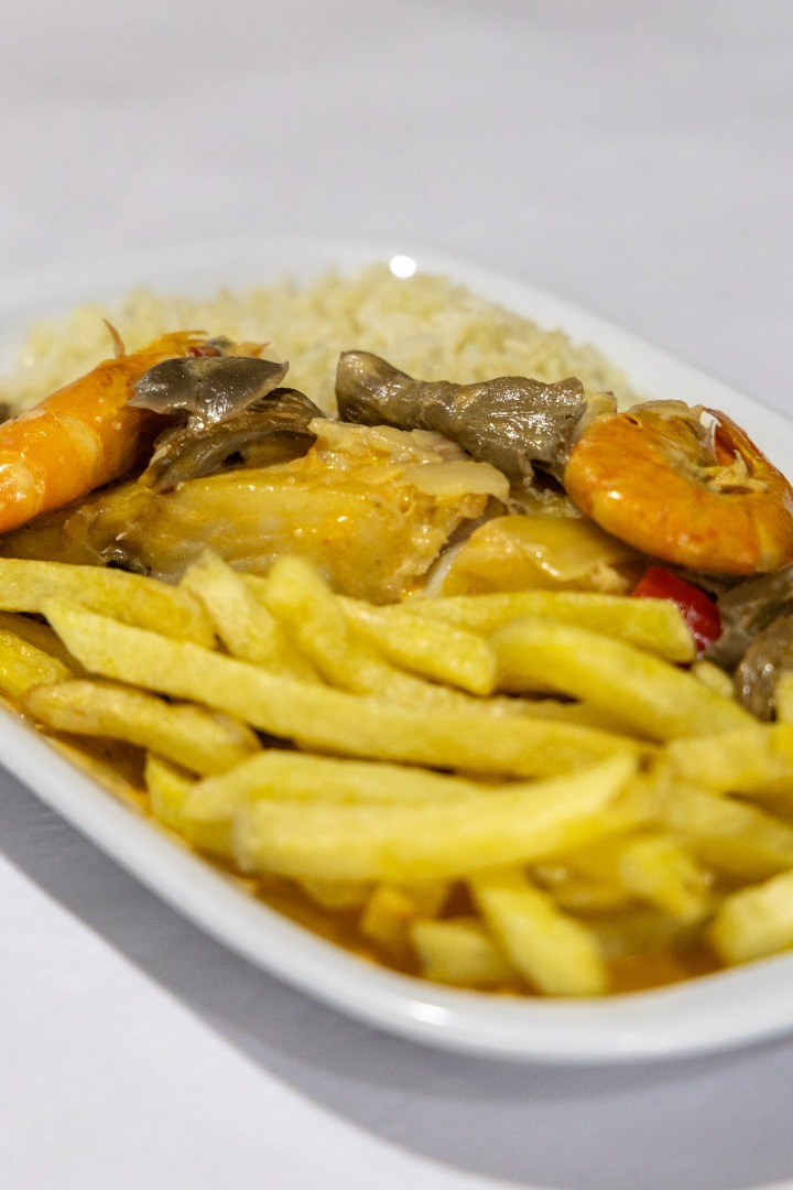 Bacalhau salteado com setas e gambas, numa combinação rica de sabores do mar e da terra.
